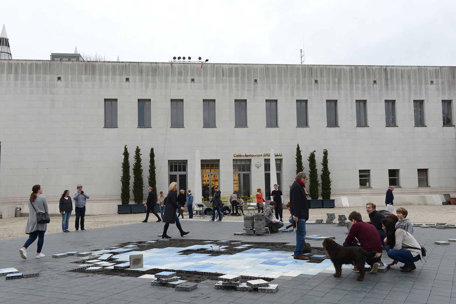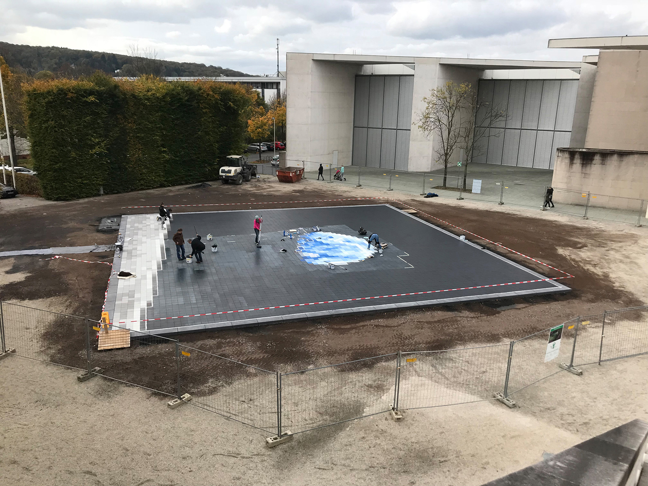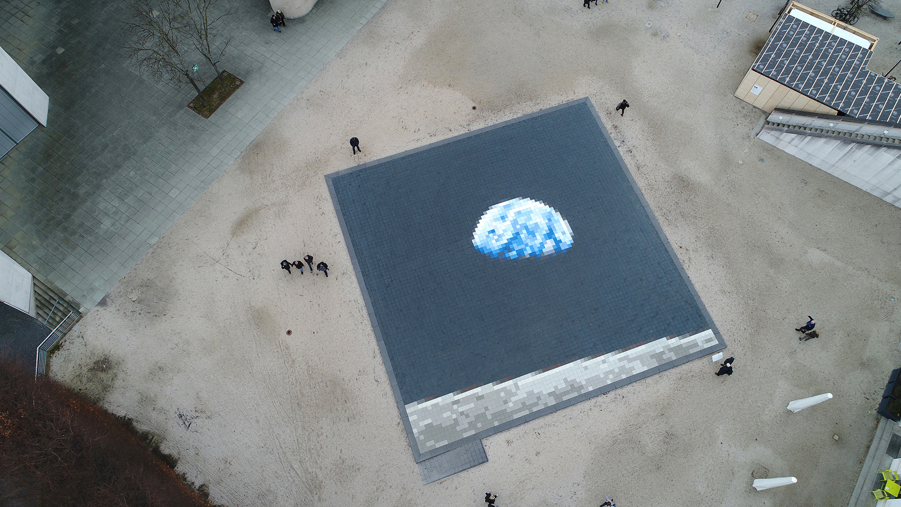 Mohné transposes Earthrise, the world-famous photograph of planet earth, from digital space into the physical space of the museum forecourt, by aligning the digital pixels of the image with a corresponding number of concrete floor tiles. He thus recreates a digital image as an analogue, large-scale mosaic composed of 6400 square floor tiles. When seen at ground level, the image is unrecognizable and apparently abstract, but it becomes readable as a pixelated image of earth in aerial photographs and satellite images. The 6400 pixels, each 25 x 25cm in size and adding up to an area of 20 x 20 meters, correspond to a digital camera resolution of just 0.0064 megapixels. Although the floor piece appears not to be aligned with its surroundings, it is situated on a north-south axis so that it is perpendicular to the grid of virtual maps and appears "upright" on virtual globes.
