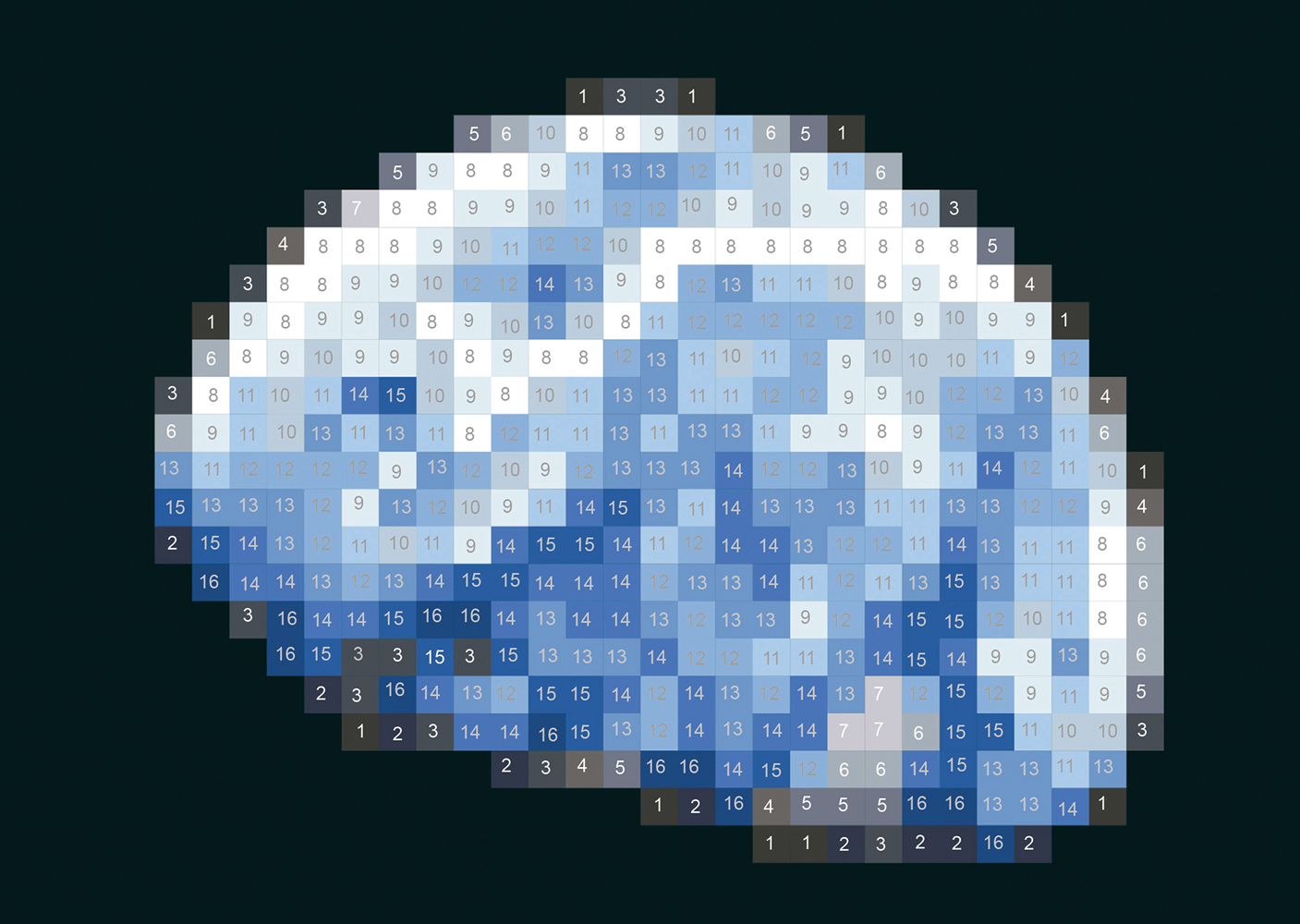 Floor piece: 6400 square floor tiles, each 25 x 25 cm, total expanse 20 x 20 m, Floor paint in different colours: 14 shades of blue, 20 shades of grey as well as white and black