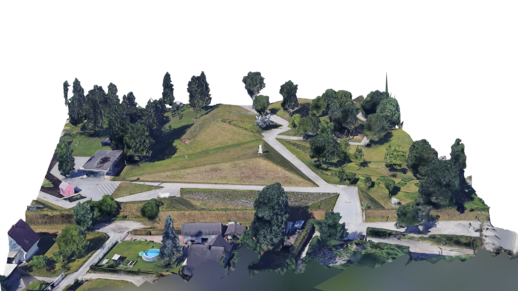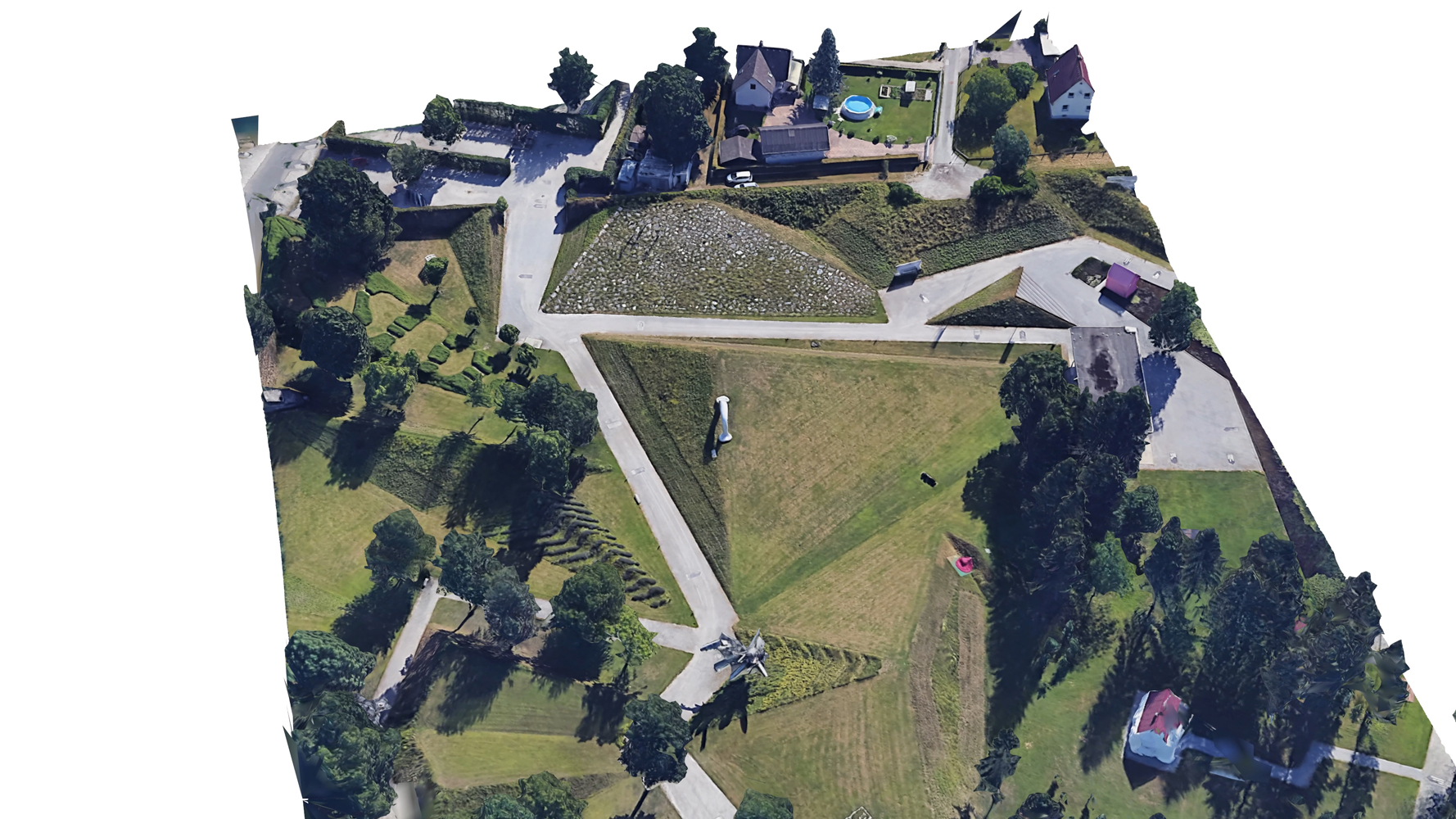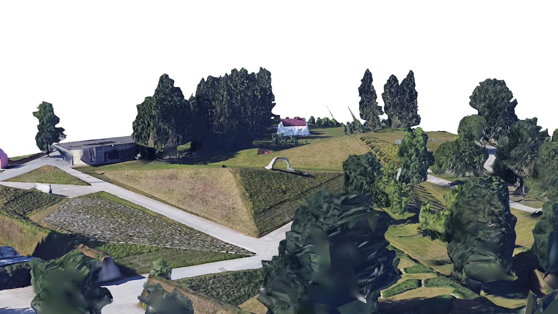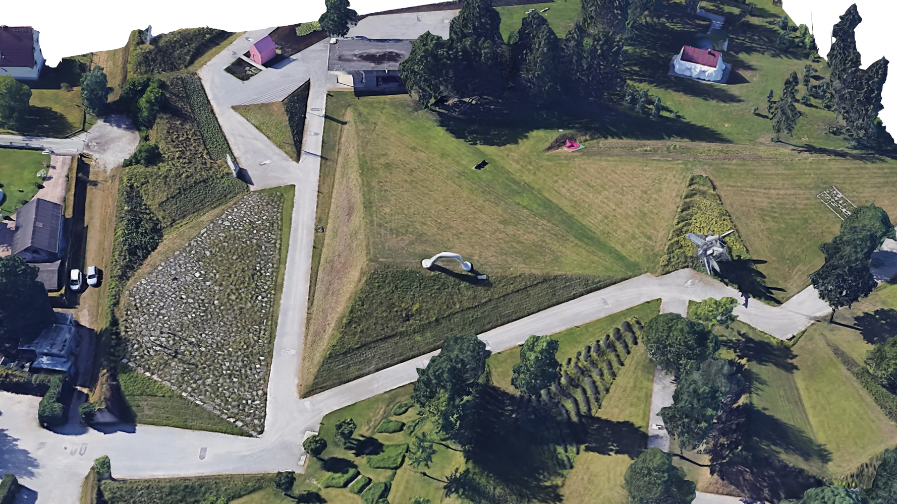 3D-Google-Earth-Model #7 of Peter Weibels land art piece "Die Erdkugel als Koffer" (The Globe as a Suitcase, 2004) at the Österreichischer Skulpturenpark in Premstätten: The video simulates a virtual drone flight around the sculpture, based on a three-dimensional model, rendered from Google Earth data by using a photogrammetric process. Idiosyncrasy of the algorithm and new forms of perceiving art in public spaces: The relationship between photography and sculpture dates back to the mediums`s invention, in the early 1930s. The series 3D-Google-Earth-Model, started in fall 2018, redefines this relationship with the help of post-photographic means, to venture new forms of viewing art in public space, through the use of satellite photography constructed as a virtual globe such as the already existing Apple Maps and Google Earth. It is the "imperfect" algorithm that gives the "accidental" 3D images their idiosyncrasy by merging the data of the geometric capture with the photographic means.