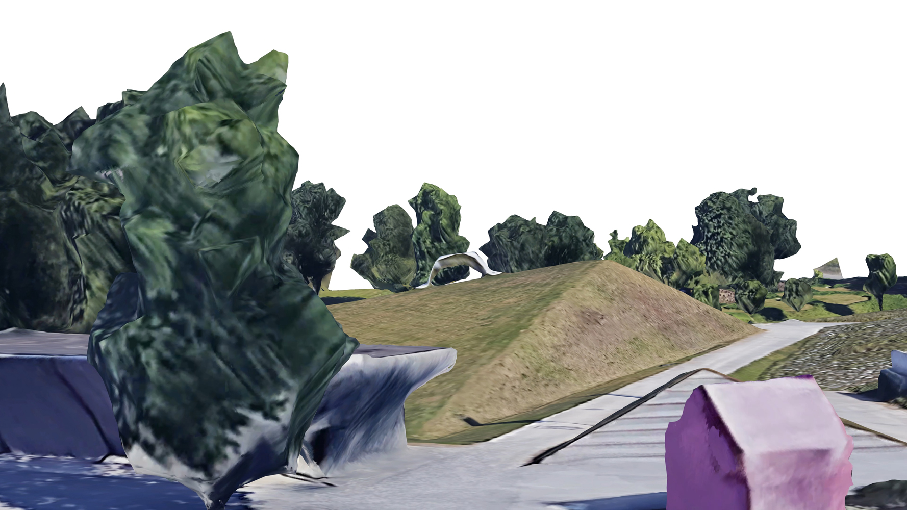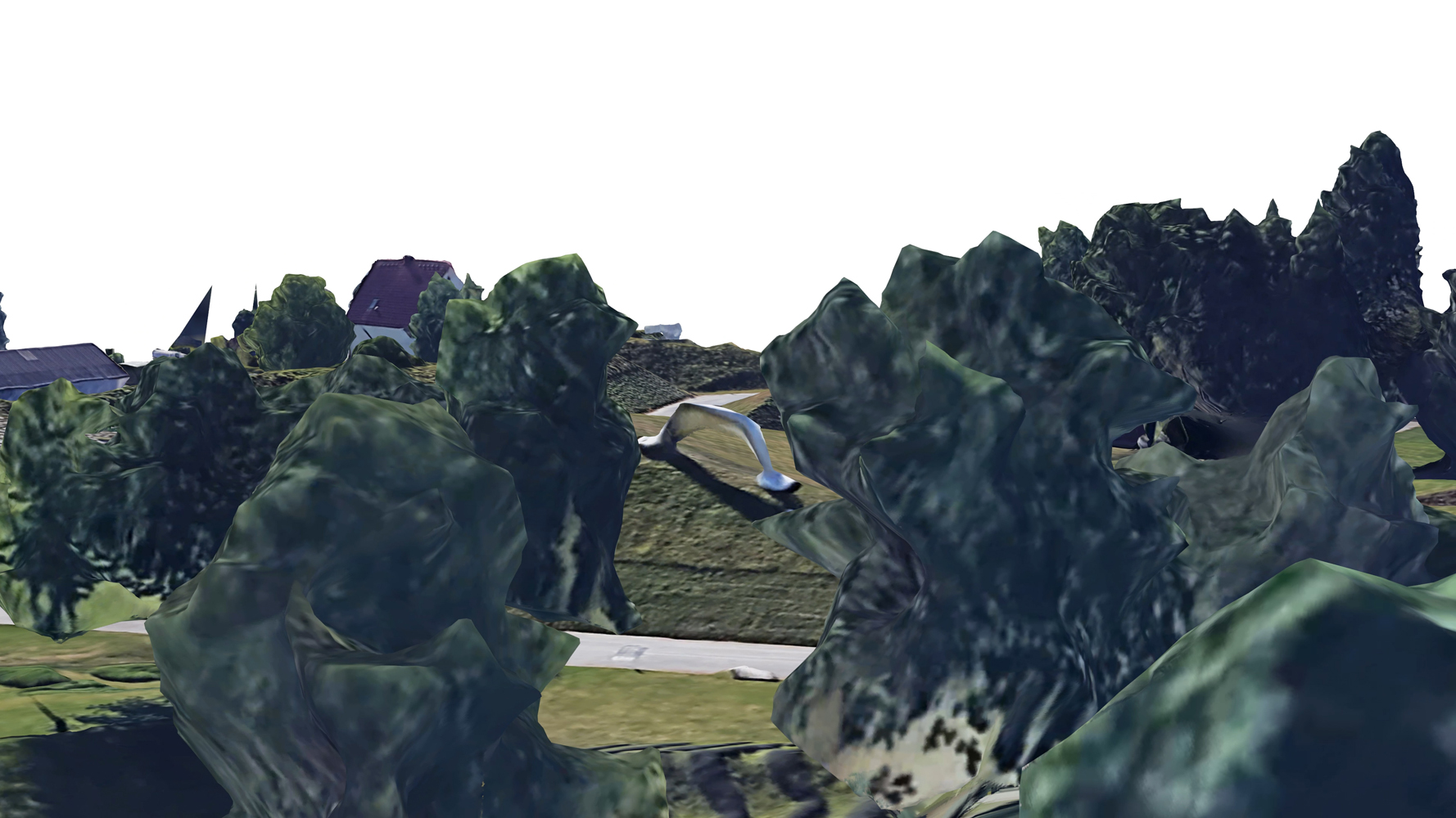 Weibel's sculpture "The globe as a suitcase" sees itself as a symbol of a mobile society that has now come to a standstill. Land Art, which lives from the space-time relationship, is re-read by virtual space: space, time, distance, proximity are shifted. Google Earth allows us to approach landscapes from a distance, but with deductions: "3D-Google Earth Model #7" reflects the glitches, the absurd appearing deformations and the "simplified language" of the algorithm: abysses, missing paths, flying trees. Where, if not in the suitcase of the globe, is the missing data stored to complete our idea of reality ? And who holds the handl ?