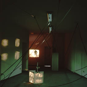 CineCorpse is a joint projectbetween Cologne (Achim Mohne´) and New York (Hermann Feldhaus), using film and computers. It stems from the Surrealist idea of the "Cadavre Exquisite". Cine Corpse does not work with drawings or poetry, but with double 8 mm film. Both authors expose only sections of a 100 ft roll of film, which is then send to New York or Cologne, where the second author finishes the roll. As we present the film (which is usally intended to be split) as 16 mm projection, both authors´theses (4 pictures at one time) can be seen simultaneously and be synthisezed by the viewer as "one film". We communicate by sending information about the films in form of text, drawings, photographs via internet. Up to this point CineCorpse has been running for 2 years, comprising of 20 films and 250 pages of e-mail.The presentation of the films are not planed linearly, but with 5-10 projectors, which are connected to the e-mails via interface, running at the same time.The visitor is able to follow the complex connection between different films and texts this way. Analogical to the cybernetic principle of the project the 16 mm loops going in all direction through the installation room. The visitor is located inside this filmsculpture.