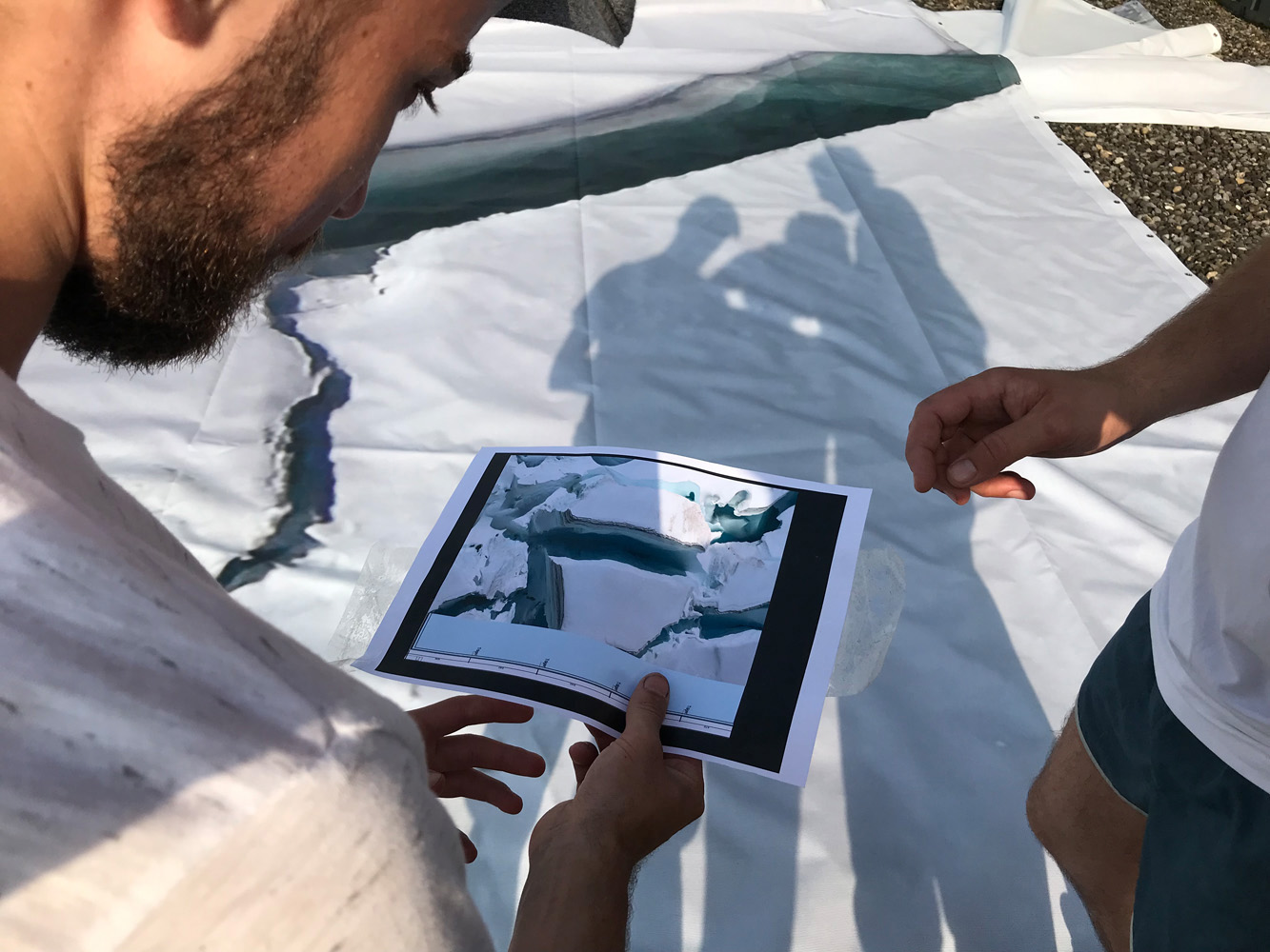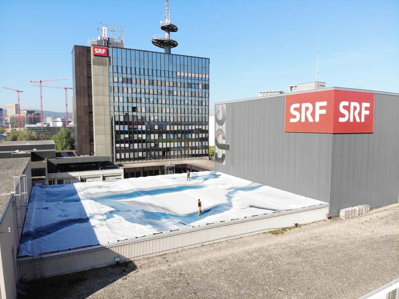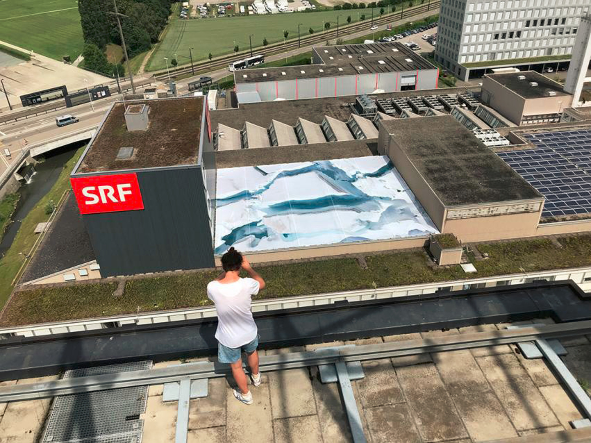 For Neuer Norden Zürich 750 square meters of the Aletsch Glacier, the largest glacier in the alpine region and a warning symbol of the ice melt has been transferred in the form of an aerial photograph (shot during a balloon ride) on the roof of Swiss television SRF, from where the daily weather forecast is broadcasted to the nation. Printed on PVC sheeting, the gravel-covered flat roof in Zurich's north is turned into a white statement against climate change. A white roof absorbs about 80% less light than a dark roof and acts as an effective weapon against increasing global warming. After the exhibition the banner will be recycled.