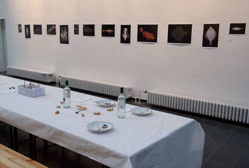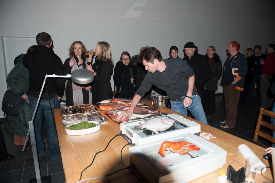 Fish, mussels & seafood were put on a flatbed scanner and ”fed“ into the computer. Afterwards the seafood was cleaned, cut and given into the prepared soup broth to cook. In the meantime, the electronic printouts of the scanned seafood were presented on the wall of the exhibition space.