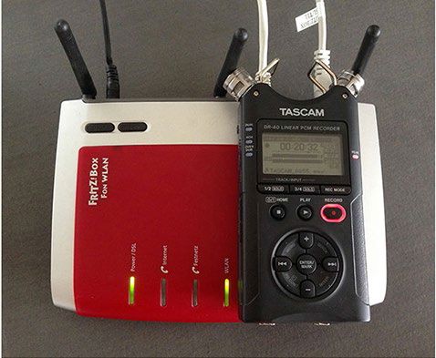 “Recordings” of a standard Wi-Fi router serve as the basis for the sound work “Fritz Kiste”. One can’t speak of regular (audio) recordings since the electronic Wi-Fi waves are soundless. But their electronic energy waves trigger the sensitive microphones of a D-40 Tascam recorder. The device is equipped with two microphones, each placed directly at one of the two antenna transmitting the Wi-Fi signal of the router – thus recording a “stereo signal” on the left and right audio recording channel.