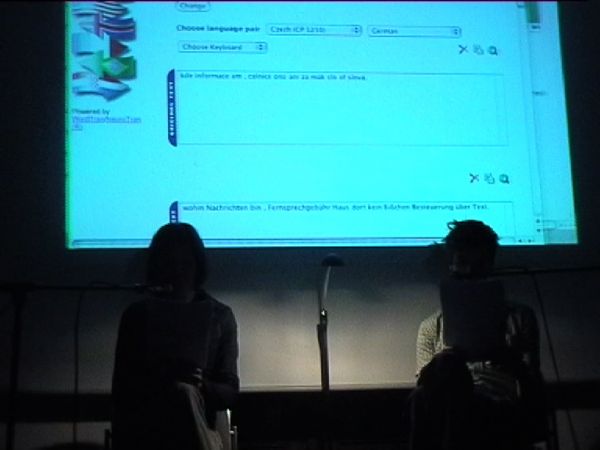 This media performance is a work-in-progress presentation based on real-time translations by an early online translation program in 2004. Written texts by contemporary German and Czech authors functioned as data set for the performance with two actors on stage. The performance starts with a ‘sound carpet’ of audio data, generated through the early text-to-speech application. Several of the texts are subsequently online-live-translated by the translation machine from German to Czech and projected on the computer screen for the audience to read. By a copy/paste method, the texts were subsequently translated back and forth between German and Czech several times so that errors exponentially increased. A Czech and a German performer (Stepanka Simlova and Achim Mohné) read the different texts (original – translation – back-translation) like a dialogue in their respective mother tongues. They ‘interpreted’ the texts by acting them out according to the “transformation of their content through the translation”.
