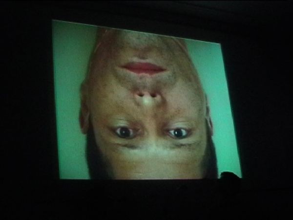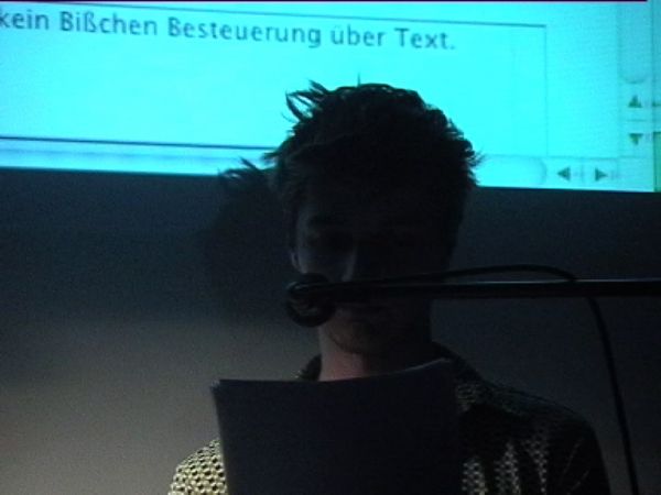 The sound documents of the computer-read verses were then played live. Silent video clips that related thematically interrupted the actions of reading. In addition to that, the Czech writer Jara Rudis with his group 'Collaps' improvised translations of his own poems, which were read aloud from the projection.