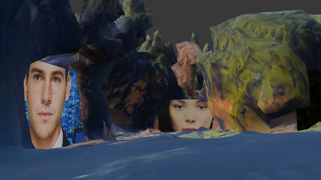 Multimedia installation, 3D rendering, 4K video, VR, AR, 3D print, vintage figurines and UV print on wallpaper