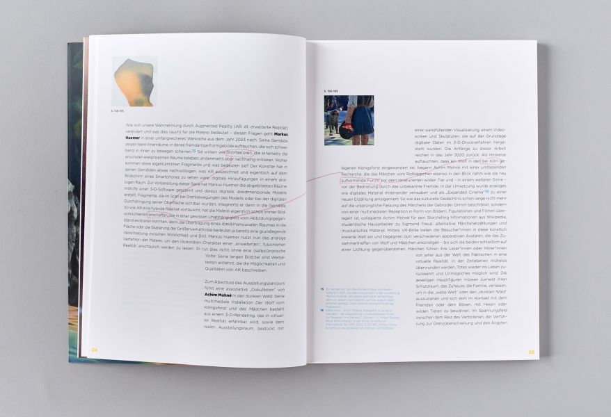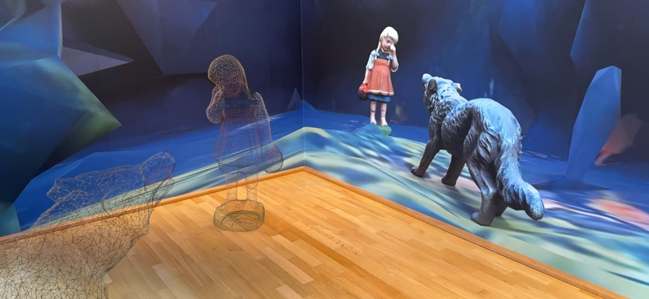 The tension between the animal and the girl, which goes back to a story by Carles Perrault from 1697 long before the highly moralised version by the Brothers Grimm, is also present in the additional augmented reality, where it is even animated. Using a QR code scan, an augmented level is superimposed on the real exhibition space on the visitor's own mobile phone, in which the figurines in the forest move semi-fluidly on the edge of a new virtual aesthetic of the 21st century.