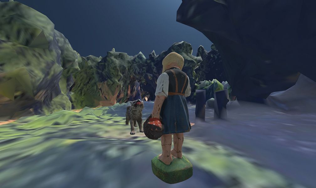 The starting point is a virtual three-dimensional model of Cologne's Königsforst forest, generated by photogrammetry from Google Earth image data and partially alienated into a mesh representation. In this forest, which can be experienced in Unity and associatively wandered through using a VR headset, a scene takes place between 3D-scanned vintage figurines of the wolf and the girl amidst a collection of video fragments that affect the scene.