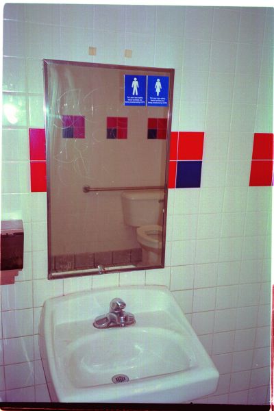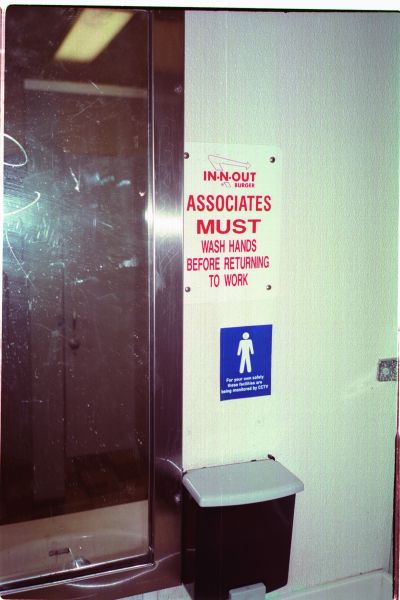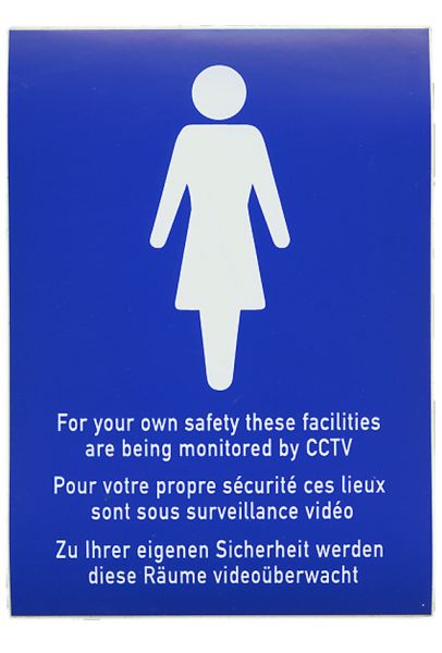 Developed in the framework of the exhibition FOR YOUR OWN SAFETY at Ludwig Forum für Internationale Kunst Aachen in 2001, this public intervention was set out to launch at approx. 500 public toilets in Aachen: in museums, theatres, public institutions, restaurants, pubs, offices, etc. and was continued worldwide. Stickers with the text “For your own safety these facilities are being monitored by CCTV” have been installed at numerous places mainly in Germany and the US to expand the exhibition in the public space. The photographic documentation of the intervention was presented in the Aachen museum exhibition and constantly being updated.