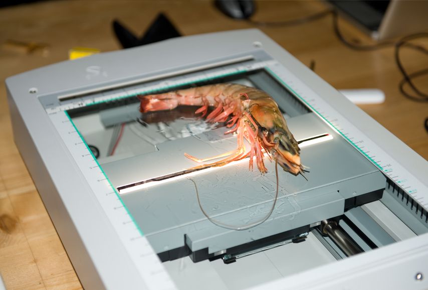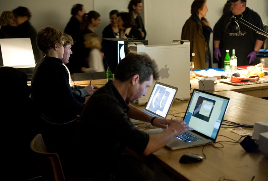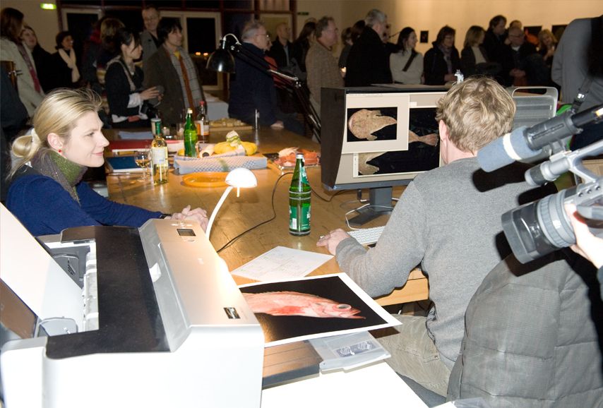Fish, mussels & seafood were put on a flatbed scanner and ”fed“ into the computer. Afterwards the seafood was cleaned, cut and given into the prepared soup broth to cook. In the meantime, the electronic printouts of the scanned seafood were presented on the wall of the exhibition space.