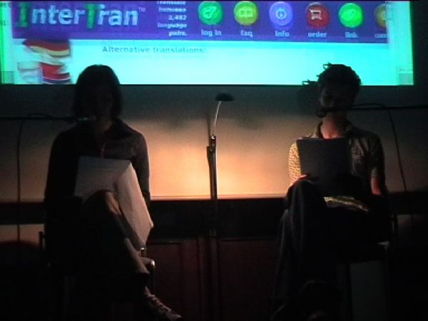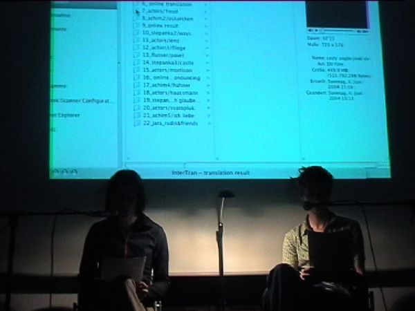This media performance is a work-in-progress presentation based on real-time translations by an early online translation program in 2004. Written texts by contemporary German and Czech authors functioned as data set for the performance with two actors on stage. The performance starts with a ‘sound carpet’ of audio data, generated through the early text-to-speech application. Several of the texts are subsequently online-live-translated by the translation machine from German to Czech and projected on the computer screen for the audience to read. By a copy/paste method, the texts were subsequently translated back and forth between German and Czech several times so that errors exponentially increased. A Czech and a German performer (Stepanka Simlova and Achim Mohné) read the different texts (original – translation – back-translation) like a dialogue in their respective mother tongues. They ‘interpreted’ the texts by acting them out according to the “transformation of their content through the translation”.