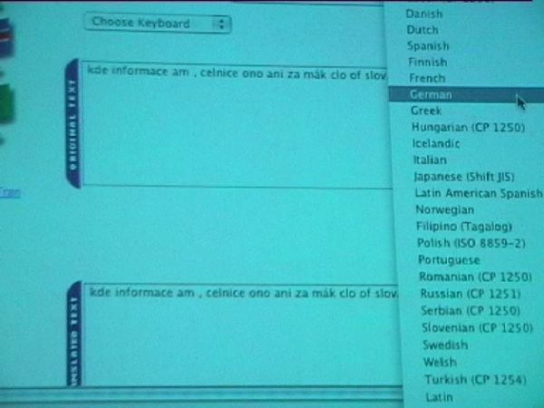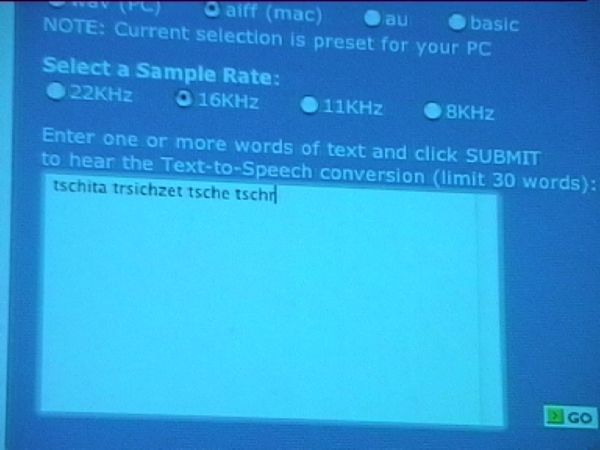 Furthermore, as part of the performance, several fragments of generated, translated text were entered online into the text-to-speech program to 'read it' out loud by the computer voice. Since a Czech version of text-to-speech did not exist at the time, the Czech texts were entered in German pronunciation, thus subverting the program. Stepanka Simlova finally dictated the Czech sentences to Achim Mohné in ‘phonetic transcription’ so that the pronunciation was understandable but with a German accent.