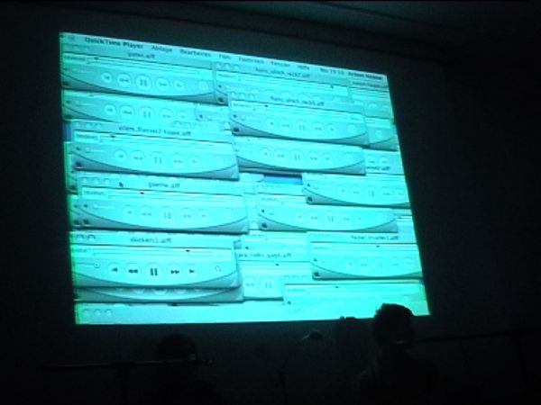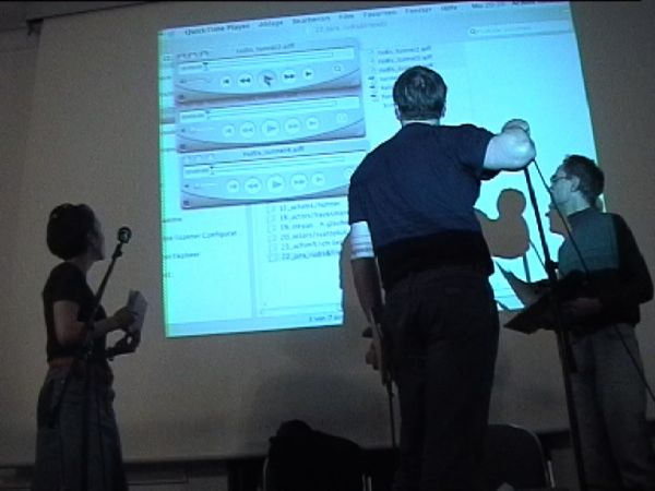 The sound documents of the computer-read verses were then played live. Silent video clips that related thematically interrupted the actions of reading. In addition to that, the Czech writer Jara Rudis with his group 'Collaps' improvised translations of his own poems, which were read aloud from the projection.