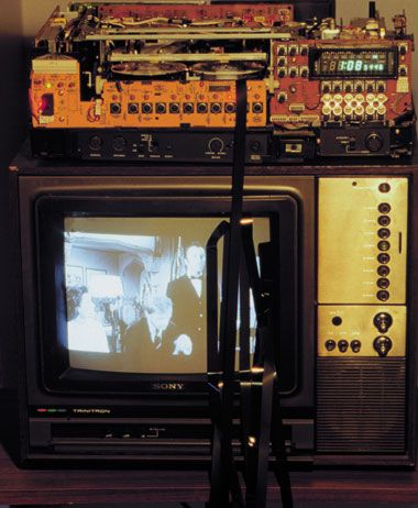 The analogy to the body of the anatomy is omnipresent, in Mohné's work as a suggestive look into the gut of modern communication technology, as in the installation ‘Hase und Igel (Hare and Hedgehog)’, as micro-sections of body parts or in the video sculpture ‘Der Kommissar (The Inspector)’, in which statically charged video tapes, resembling excrement, leave the inside of the recorder to stick to the monitor for a while in constant change and then fall to the floor. This happens, as it were, after a completed metabolism, the correlate of which was able to entertain the television nation of the sixties and seventies in the form of stereotypically produced series - reminiscences of the artist's own media socialisation.