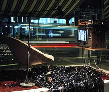 Installation for television, uncovered video recorder, sofa and carpet. Recordings of popular programmes are played that defined the television culture of the sixties and seventies, media imprints of Achim Mohné's childhood. The tapes run out of the playing recorder. They briefly stick to the television screen due to the static charge, fall to the floor and thus constantly fill the staged living space.