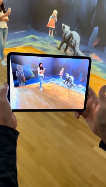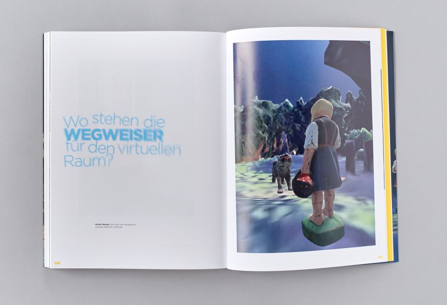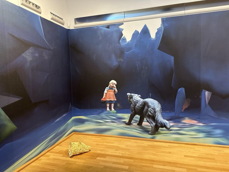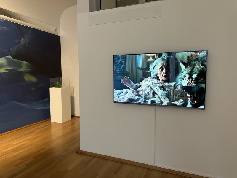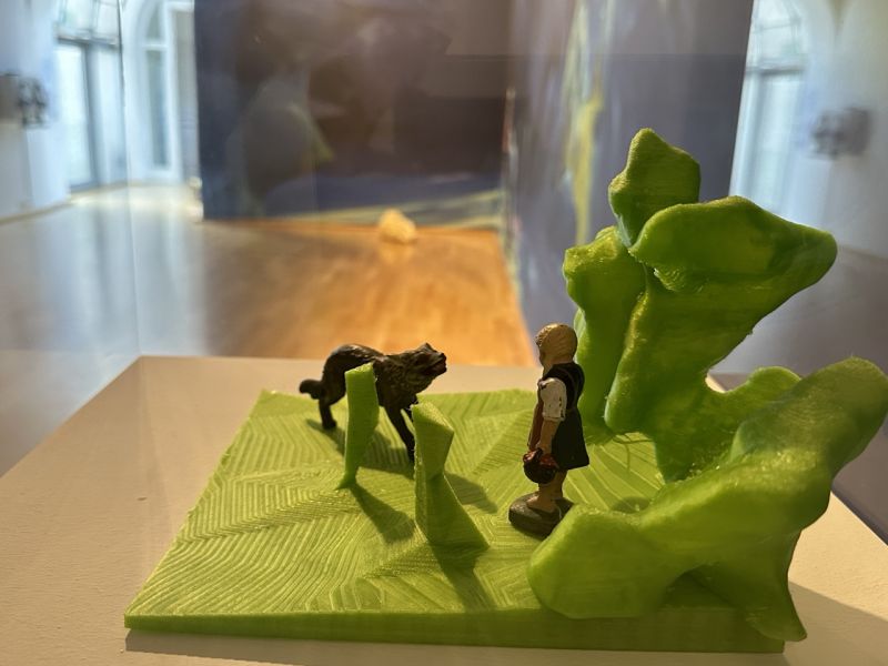 The tension between the animal and the girl, which goes back to a story by Carles Perrault from 1697 long before the highly moralised version by the Brothers Grimm, is also present in the additional augmented reality, where it is even animated. Using a QR code scan, an augmented level is superimposed on the real exhibition space on the visitor's own mobile phone, in which the figurines in the forest move semi-fluidly on the edge of a new virtual aesthetic of the 21st century.