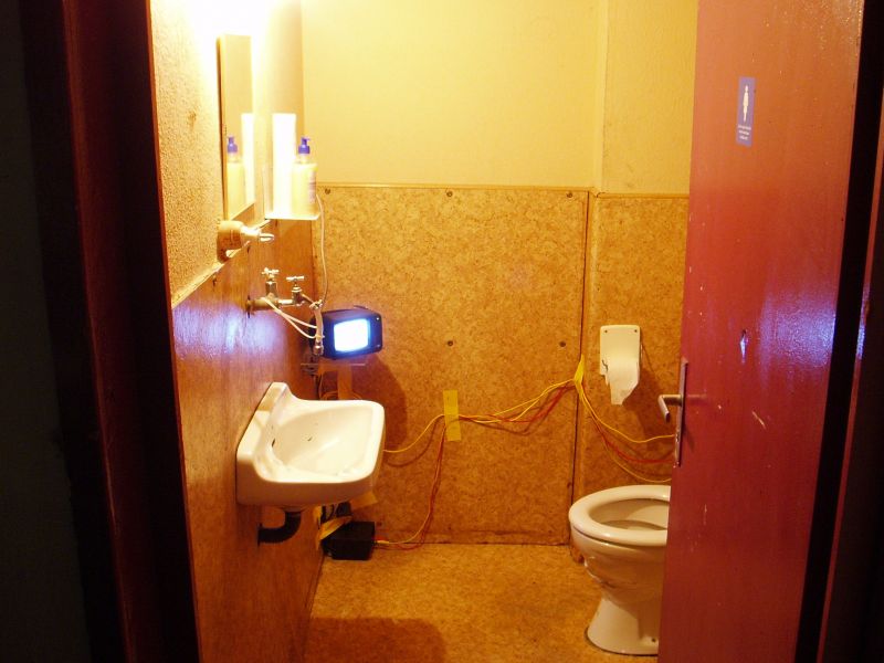 In this close-circuit video installation, toilet users can watch themselves while using the toilet on a screen in their own toilet cubicle. In contrast to the work series ‘For your own Safety these facilities are being monitored by CCTV’, which simulates the impression of live broadcasts from the toilet rooms into the exhibition rooms, this installation is not only giving an impression: the toilet user is indeed watching live-recorded material, however he or she remains in the privacy of his/her own videographic self-observation.